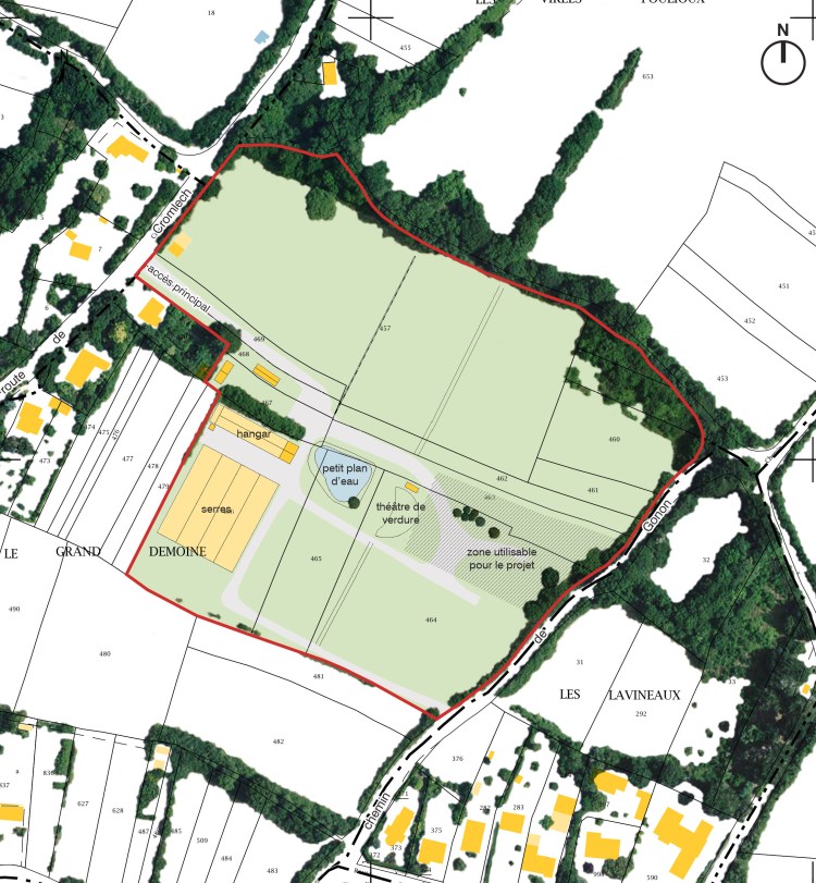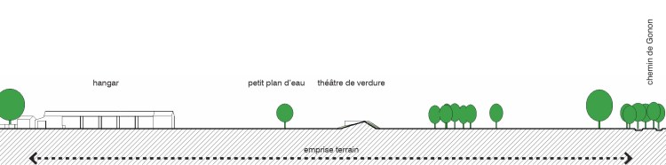 à gauche: zone utilisable pour le projet; à droite: théâtre de verdure et petit plan d’eau